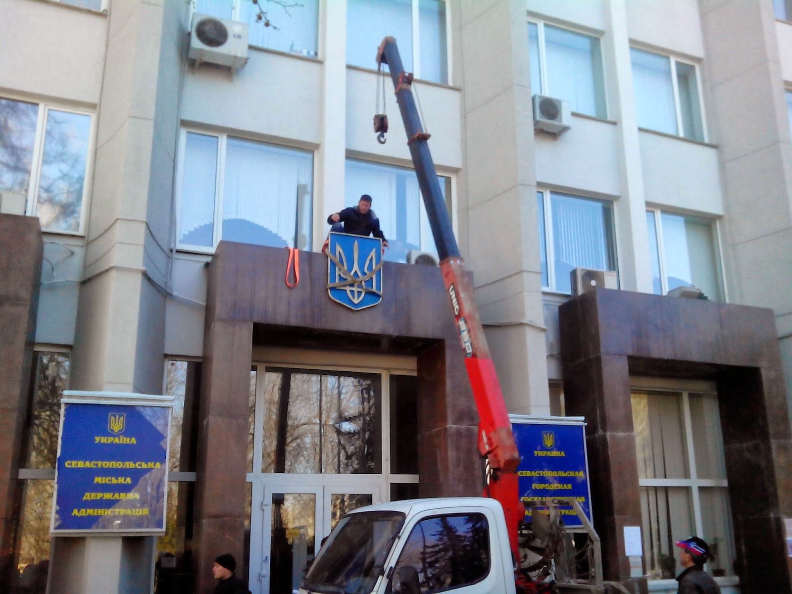 После принятия постановления «О независимости Крыма» на внеочередном пленарном заседании Верховного Совета АРК 17 марта 2014 года. В Севастополе начался демонтаж украинской символики с административных зданий.