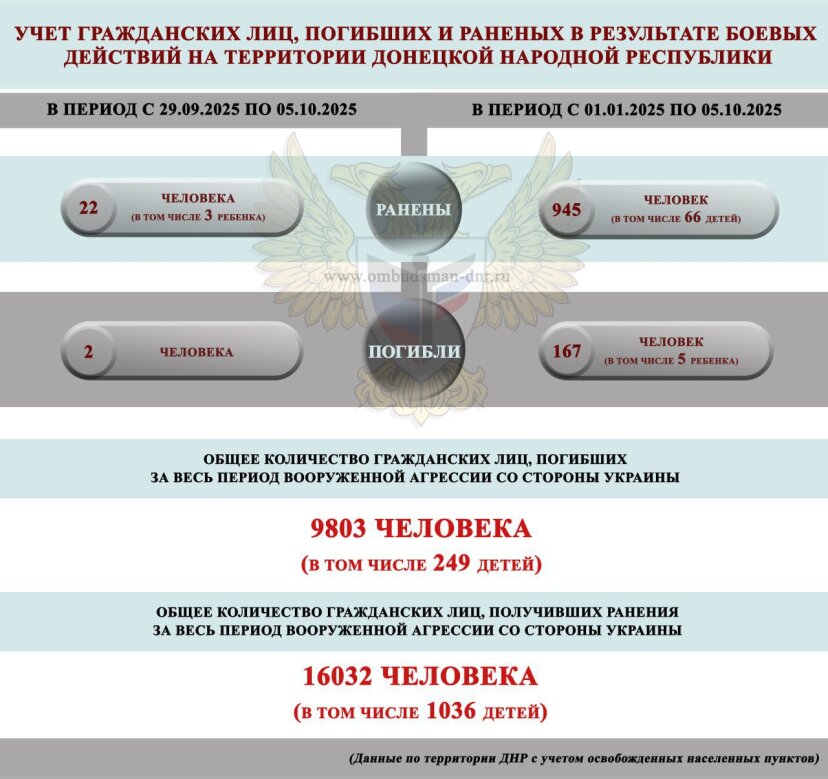 15:50 За прошедшую неделю с 29 сентября по 5 октября в ДНР в результате обстрелов ВСУ погибли 2 мирных жителя, ранения получили 22 мирных жителя, в том числе три ребёнка