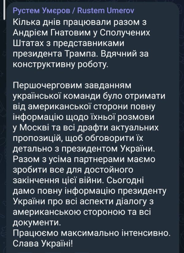 12:30 Умеров сообщил, что сегодня Зеленский получит полную информацию о переговорах с США