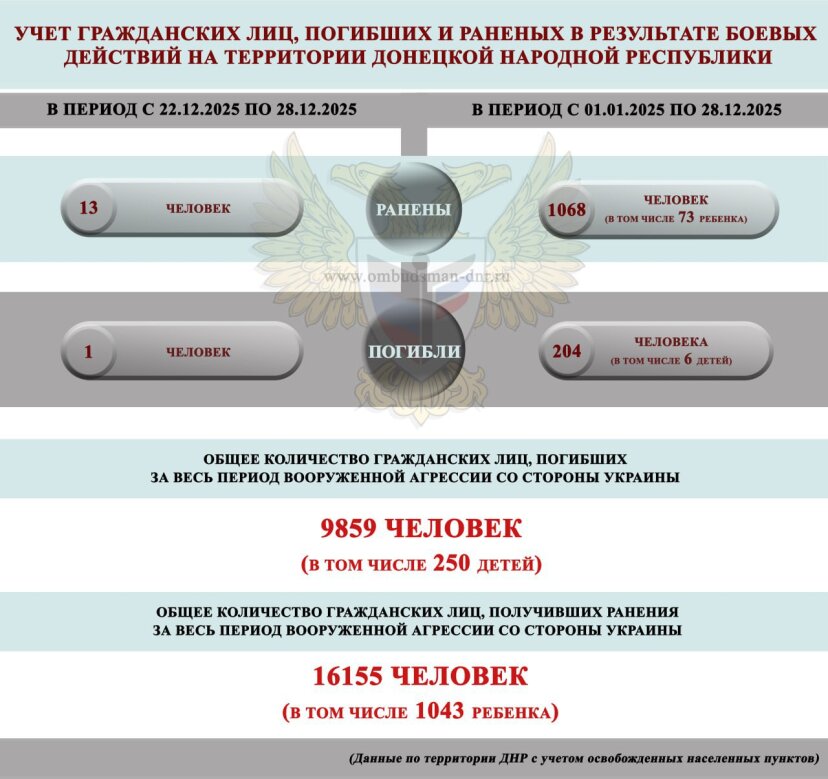 12:15 За прошедшую неделю с 22 по 28 декабря ДНР в результате обстрелов ВСУ погиб один мирный житель, ранения получили 13 мирных жителей