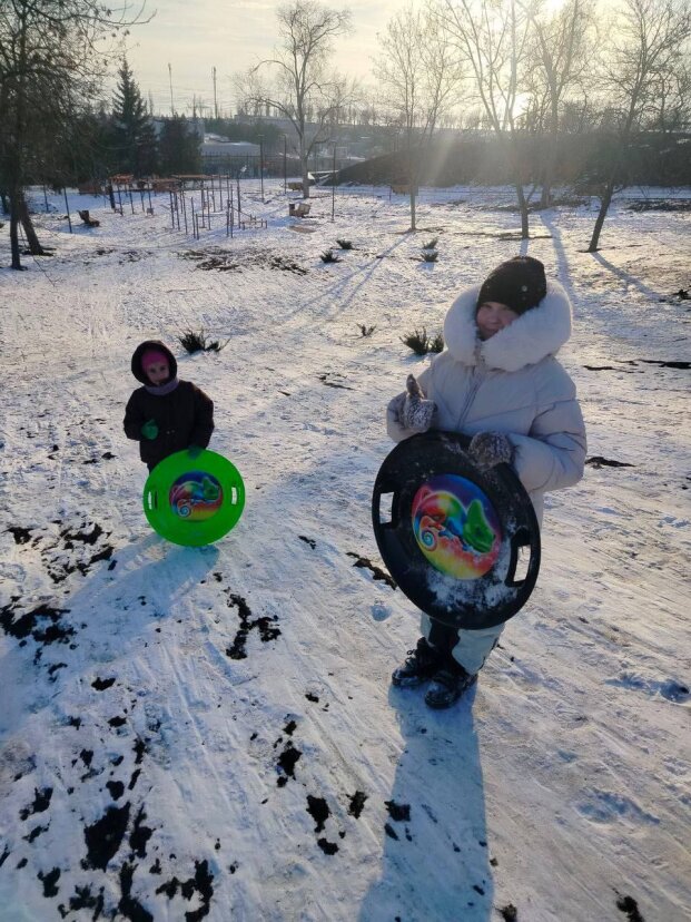 На улице снежно, поэтому в этот раз, кроме стандартной помощи (продукты, средства гигиены, медикаменты и игрушки) развезли деткам санки и ледянки.