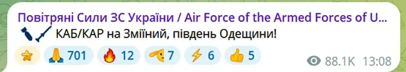 Перед этим в Одесской области звучали сигналы воздушной тревоги. Змеиный расположен почти в 25 километрах восточнее материкового побережья. Один из пророссийских каналов Одессы съязвил по этому поводу: