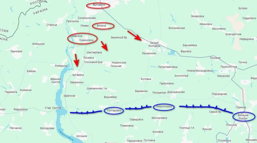 ВСУ начали выстраивать новую линию обороны на рубеже Гонтаровка — Кирилловка — Великий Бурлук. Предполагается, что оборудованная по всем канонам инженерного искусства данная оборонительная линия остановит дальнейшее наступление российских войск. Для более быстрого ее строительства задействован инженерный батальон 710-й отдельной бригады охраны, а также мирное население, в основном из Харькова. Копают окопы и блиндажи.
